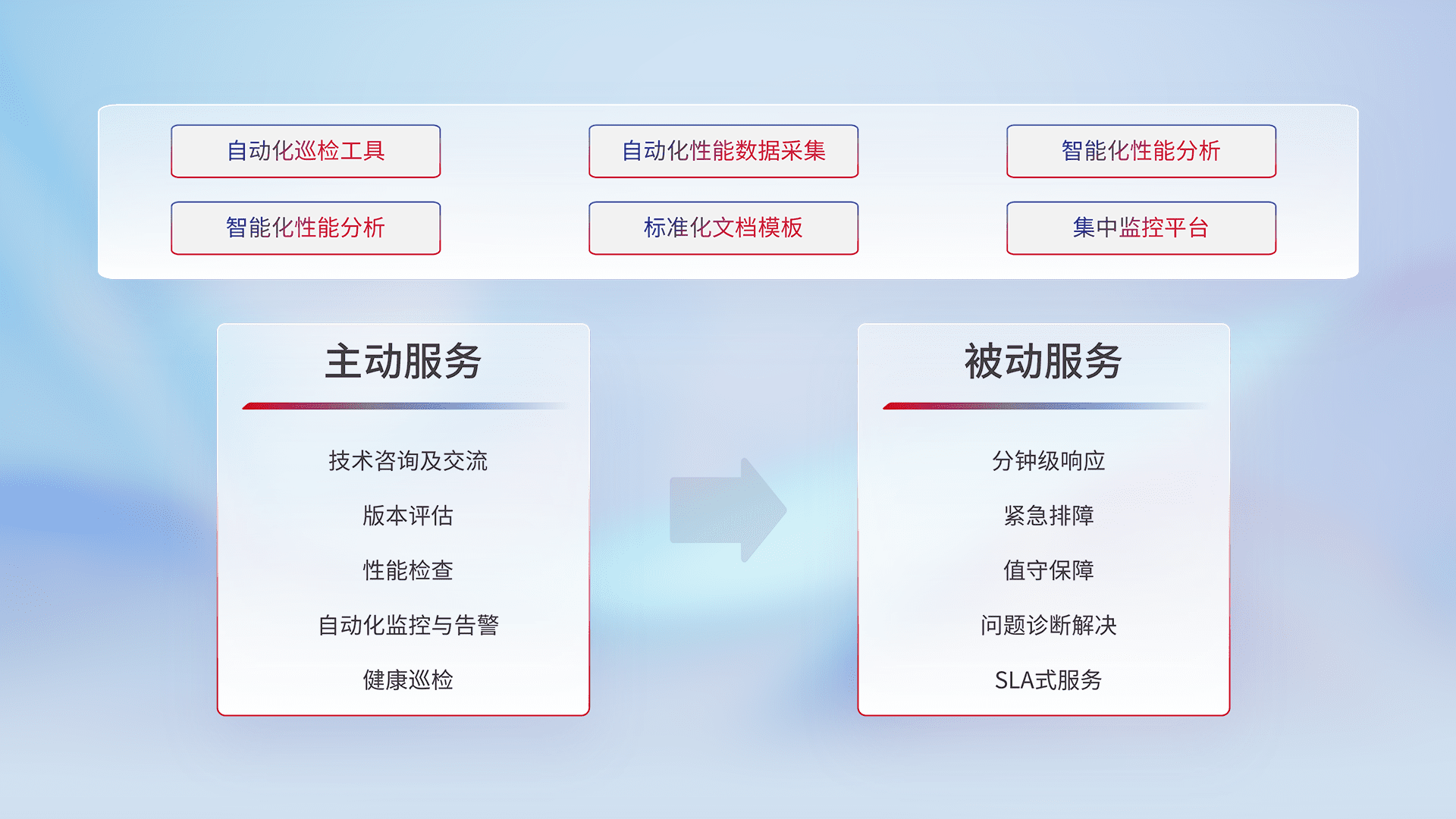 智能化工具和标准化文档,,,,保障服务质量,,,,提供主动服务(包含技术咨询、、版本评估、、、、性能检查、、、、自动化监控与告警、、、、健康巡检)和被动服务包含(分钟级响应、、、、紧急排障、、、、值守保障、、、、问题诊断解决、、、、SLA服务)。。